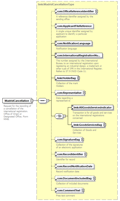 | children | com:OfficeReferenceIdentifier com:ApplicantFileReference com:NotificationLanguage com:InternationalRegistrationNumber tmk:HolderBag com:Representative tmk:AllGoodsServicesIndicator tmk:GoodsServicesBag com:SignatureBag com:RecordIdentifier com:RecordNotificationDate com:DocumentIncludedBag com:CommentText | ||||