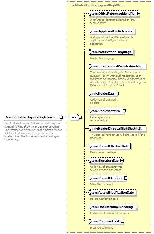 | children | com:OfficeReferenceIdentifier com:ApplicantFileReference com:NotificationLanguage com:InternationalRegistrationNumber tmk:HolderBag com:Representative tmk:HolderDisposalRightRestrictionCategory com:RecordEffectiveDate com:SignatureBag com:RecordIdentifier com:RecordNotificationDate com:DocumentIncludedBag com:CommentText | ||||