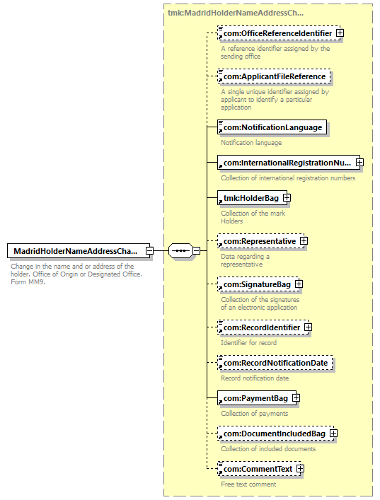 | children | com:OfficeReferenceIdentifier com:ApplicantFileReference com:NotificationLanguage com:InternationalRegistrationNumberBag tmk:HolderBag com:Representative com:SignatureBag com:RecordIdentifier com:RecordNotificationDate com:PaymentBag com:DocumentIncludedBag com:CommentText | ||||