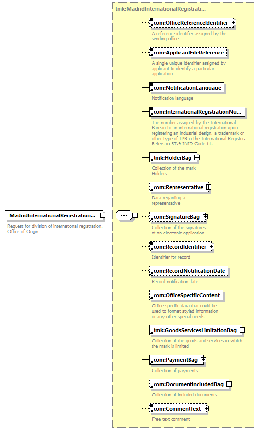 | children | com:OfficeReferenceIdentifier com:ApplicantFileReference com:NotificationLanguage com:InternationalRegistrationNumber tmk:HolderBag com:Representative com:SignatureBag com:RecordIdentifier com:RecordNotificationDate com:OfficeSpecificContent tmk:GoodsServicesLimitationBag com:PaymentBag com:DocumentIncludedBag com:CommentText | ||||