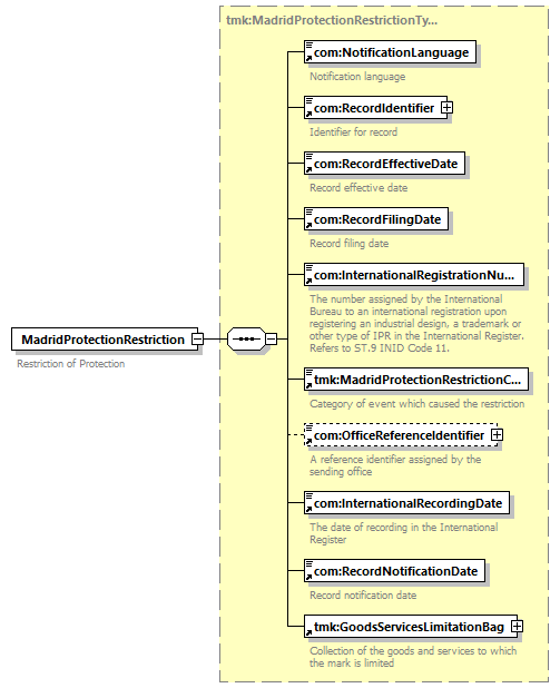 | children | com:NotificationLanguage com:RecordIdentifier com:RecordEffectiveDate com:RecordFilingDate com:InternationalRegistrationNumber tmk:MadridProtectionRestrictionCategory com:OfficeReferenceIdentifier com:InternationalRecordingDate com:RecordNotificationDate tmk:GoodsServicesLimitationBag | ||||