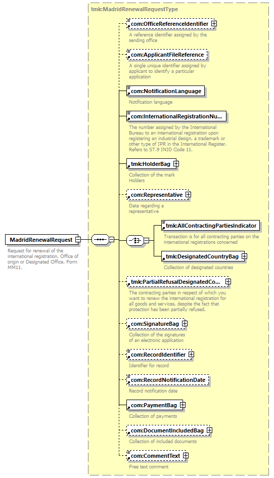 | children | com:OfficeReferenceIdentifier com:ApplicantFileReference com:NotificationLanguage com:InternationalRegistrationNumber tmk:HolderBag com:Representative tmk:AllContractingPartiesIndicator tmk:DesignatedCountryBag tmk:PartialRefusalDesignatedCountryBag com:SignatureBag com:RecordIdentifier com:RecordNotificationDate com:PaymentBag com:DocumentIncludedBag com:CommentText | ||||