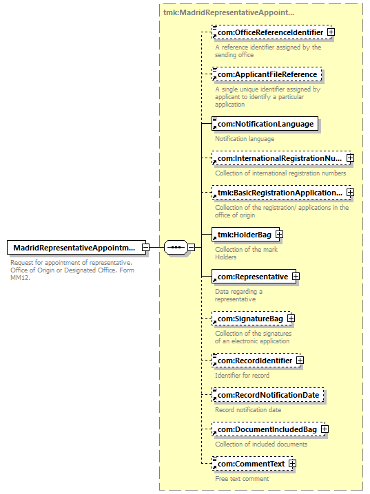 | children | com:OfficeReferenceIdentifier com:ApplicantFileReference com:NotificationLanguage com:InternationalRegistrationNumberBag tmk:BasicRegistrationApplicationBag tmk:HolderBag com:Representative com:SignatureBag com:RecordIdentifier com:RecordNotificationDate com:DocumentIncludedBag com:CommentText | ||||