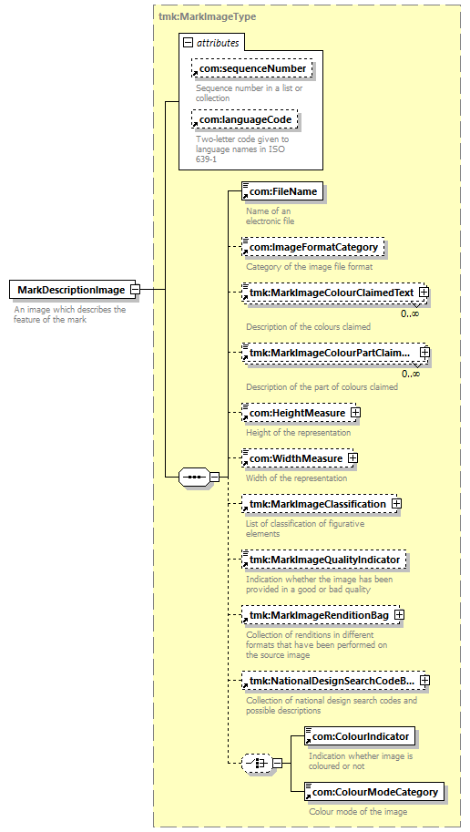 | children | com:FileName com:ImageFormatCategory tmk:MarkImageColourClaimedText tmk:MarkImageColourPartClaimedText com:HeightMeasure com:WidthMeasure tmk:MarkImageClassification tmk:MarkImageQualityIndicator tmk:MarkImageRenditionBag tmk:NationalDesignSearchCodeBag com:ColourIndicator com:ColourModeCategory | |||||||||||||||||||||||||||||||||