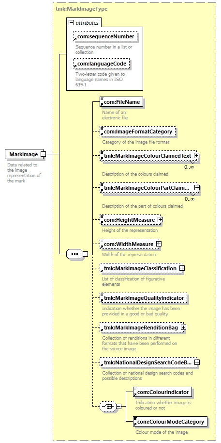 | children | com:FileName com:ImageFormatCategory tmk:MarkImageColourClaimedText tmk:MarkImageColourPartClaimedText com:HeightMeasure com:WidthMeasure tmk:MarkImageClassification tmk:MarkImageQualityIndicator tmk:MarkImageRenditionBag tmk:NationalDesignSearchCodeBag com:ColourIndicator com:ColourModeCategory | |||||||||||||||||||||||||||||||||