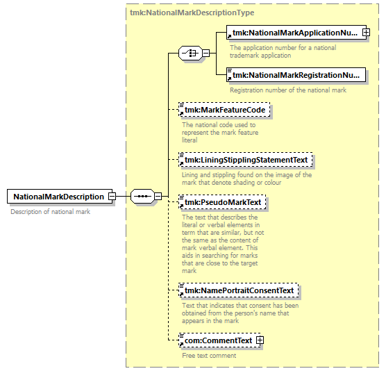 | children | tmk:NationalMarkApplicationNumber tmk:NationalMarkRegistrationNumber tmk:MarkFeatureCode tmk:LiningStipplingStatementText tmk:PseudoMarkText tmk:NamePortraitConsentText com:CommentText | ||||