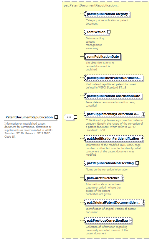| children | pat:RepublicationCategory com:Version com:PublicationDate pat:RepublishedPatentDocumentKindCode pat:RepublicationCancellationDate pat:SupplementaryCorrectionCodeBag pat:ModificationPartIdentification pat:RepublicationNoteTextBag pat:GazetteReference pat:OriginalPatentDocumentIdentification pat:PreviousCorrectionBag | ||||