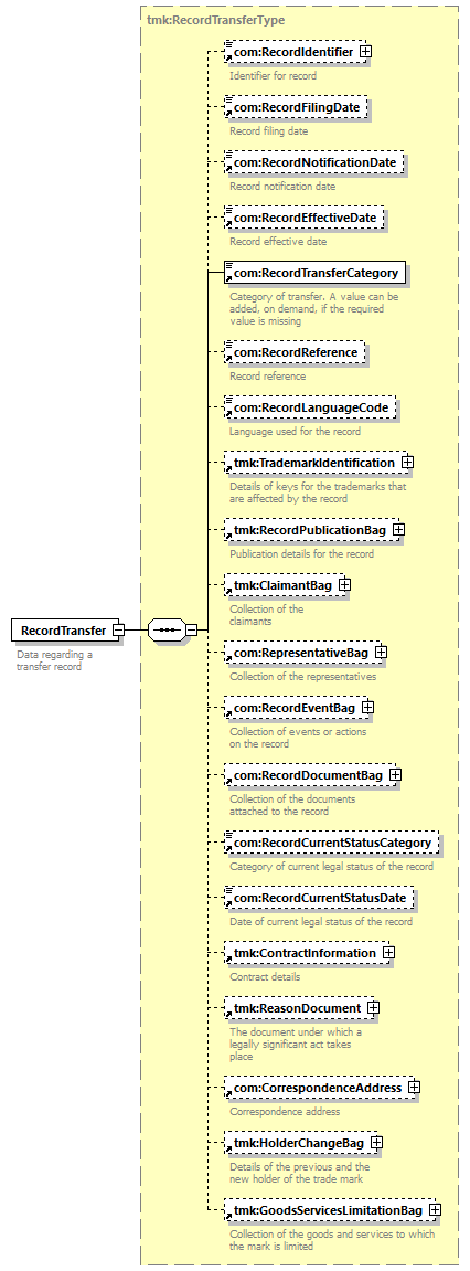 | children | com:RecordIdentifier com:RecordFilingDate com:RecordNotificationDate com:RecordEffectiveDate com:RecordTransferCategory com:RecordReference com:RecordLanguageCode tmk:TrademarkIdentification tmk:RecordPublicationBag tmk:ClaimantBag com:RepresentativeBag com:RecordEventBag com:RecordDocumentBag com:RecordCurrentStatusCategory com:RecordCurrentStatusDate tmk:ContractInformation tmk:ReasonDocument com:CorrespondenceAddress tmk:HolderChangeBag tmk:GoodsServicesLimitationBag | ||||