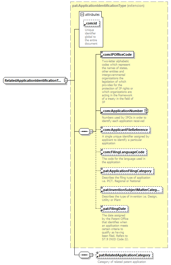| children | com:IPOfficeCode com:ApplicationNumber com:ApplicantFileReference com:FilingLanguageCode pat:ApplicationFilingCategory pat:InventionSubjectMatterCategory pat:FilingDate pat:RelatedApplicationCategory | ||||||||||||||||||||||