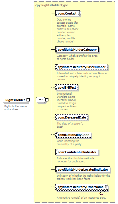 | children | com:Contact cpy:RightsHolderCategory cpy:InterestedPartyBaseNumber cpy:ISNIText com:DeceasedDate com:NationalityCode com:ConfidentialIndicator cpy:RightsHolderLocatedIndicator cpy:InterestedPartyOtherName | ||||