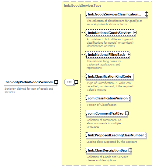 | children | tmk:GoodsServicesClassificationBag tmk:NationalGoodsServices tmk:NationalFilingBasis tmk:ClassificationKindCode com:ClassificationVersion com:CommentTextBag tmk:ProposedLeadingClassNumber tmk:ClassDescriptionBag | ||||