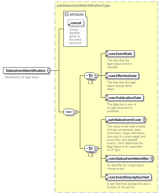 | children | com:EventDate com:EffectiveDate com:PublicationDate pat:StatusEventCode com:StatusEventIdentifier com:EventDescriptionText | ||||||||||||||||||||||