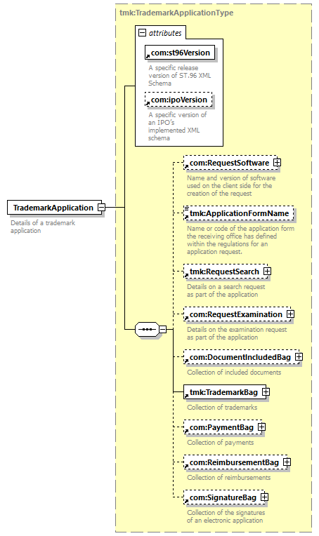 | children | com:RequestSoftware tmk:ApplicationFormName tmk:RequestSearch com:RequestExamination com:DocumentIncludedBag tmk:TrademarkBag com:PaymentBag com:ReimbursementBag com:SignatureBag | |||||||||||||||||||||||||||||||||