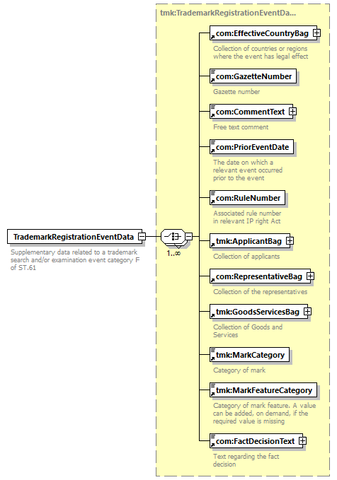 | children | com:EffectiveCountryBag com:GazetteNumber com:CommentText com:PriorEventDate com:RuleNumber tmk:ApplicantBag com:RepresentativeBag tmk:GoodsServicesBag tmk:MarkCategory tmk:MarkFeatureCategory com:FactDecisionText | ||||