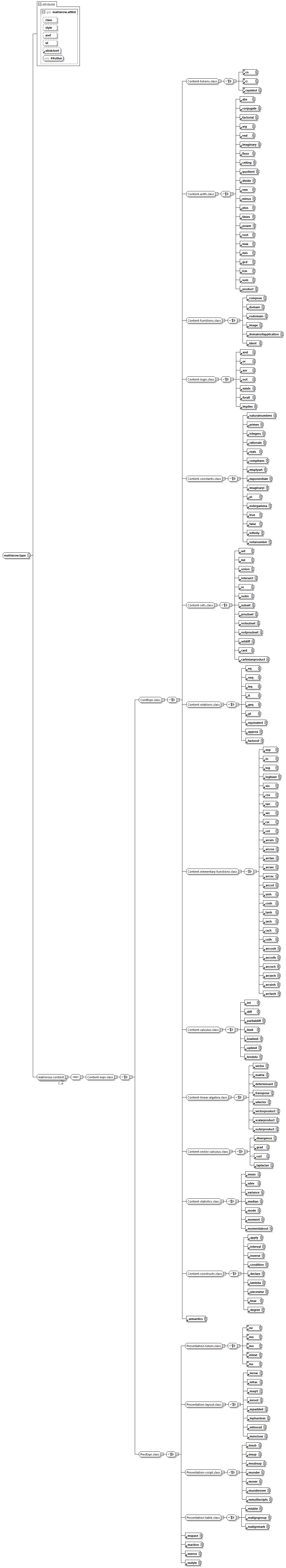 children   cn ci csymbol abs conjugate factorial arg real imaginary floor ceiling quotient divide rem minus plus times power root max min gcd lcm sum product compose domain codomain image domainofapplication ident and or xor not exists forall implies naturalnumbers primes integers rationals reals complexes emptyset exponentiale imaginaryi pi eulergamma true false infinity notanumber set list union intersect in notin subset prsubset notsubset notprsubset setdiff card cartesianproduct eq neq leq lt geq gt equivalent approx factorof exp ln log logbase sin cos tan sec csc cot arcsin arccos arctan arcsec arccsc arccot sinh cosh tanh sech csch coth arccosh arccoth arccsch arcsech arcsinh arctanh int diff partialdiff limit lowlimit uplimit tendsto vector matrix determinant transpose selector vectorproduct scalarproduct outerproduct divergence grad curl laplacian mean sdev variance median mode moment momentabout apply interval inverse condition declare lambda piecewise bvar degree semantics mi mo mn mtext ms mrow mfrac msqrt mroot mpadded mphantom mfenced menclose msub msup msubsup munder mover munderover mmultiscripts mtable maligngroup malignmark mspace maction merror mstyle