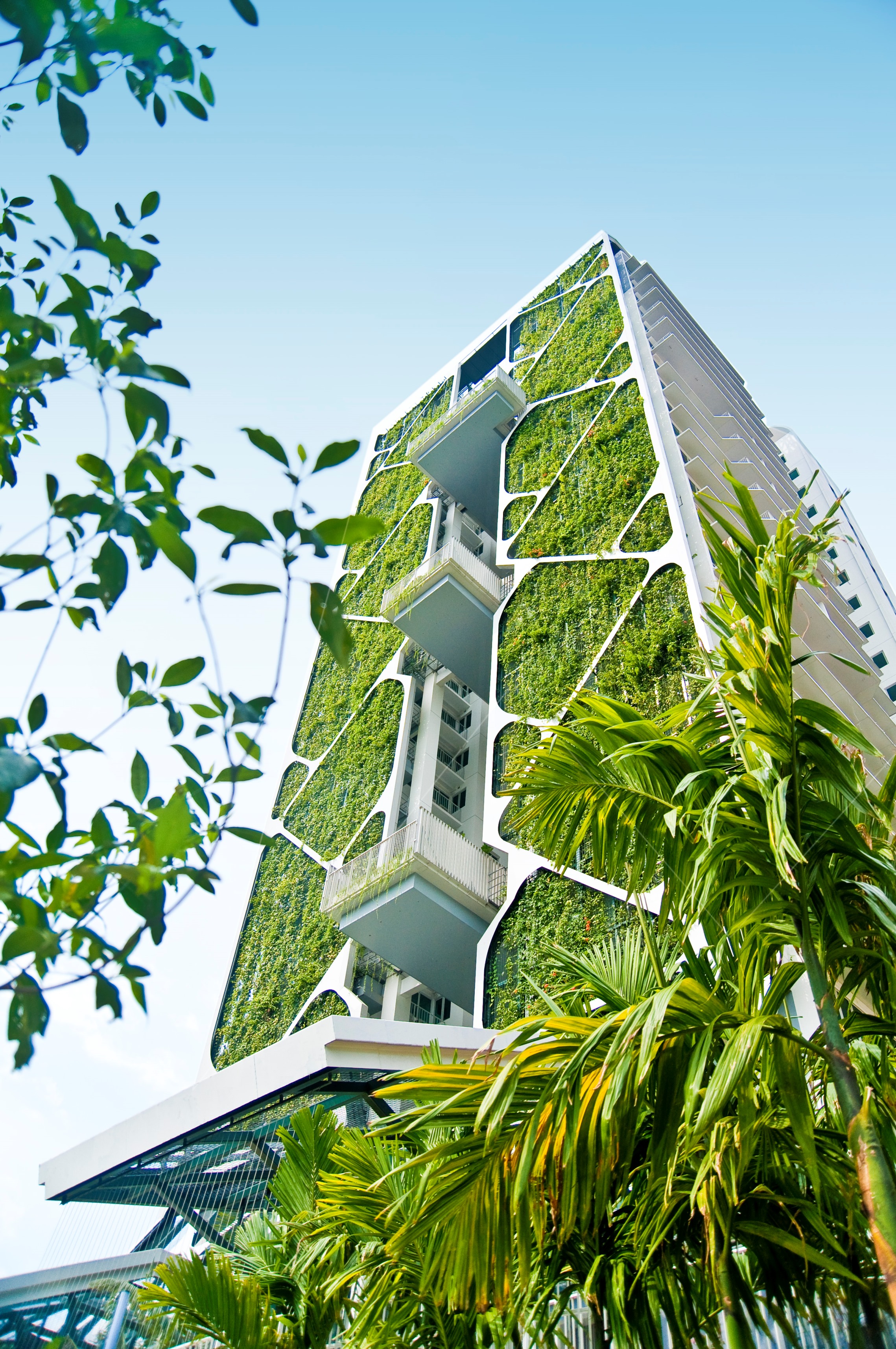 One innovative green wall in a residential building in Singapore is the “Tree House” condominium, located in the Bukit Timah area. The Tree House is home to one of the world’s largest vertical gardens, earning a Guinness World Record for its impressive size in 2014. Spanning 2,289 square meters and 24 stories high, the garden is expected to save over $500,000 annually in energy and water costs. It features heat-reducing windows and motion-sensor lighting for added efficiency. Designed by City Developments Limited (CDL), the green wall filters pollutants and carbon dioxide, reducing the estate’s carbon footprint and cooling energy needs. The vertical garden serves as a “Bio-shield,” enhancing greenery continuity with the surrounding environment while lowering solar radiation. Additionally, three layers of sky gardens on the 7th, 13th and 19th floors, adorned with climbing plants, provide extra green space and shade for residents, further contributing to the building’s sustainable design