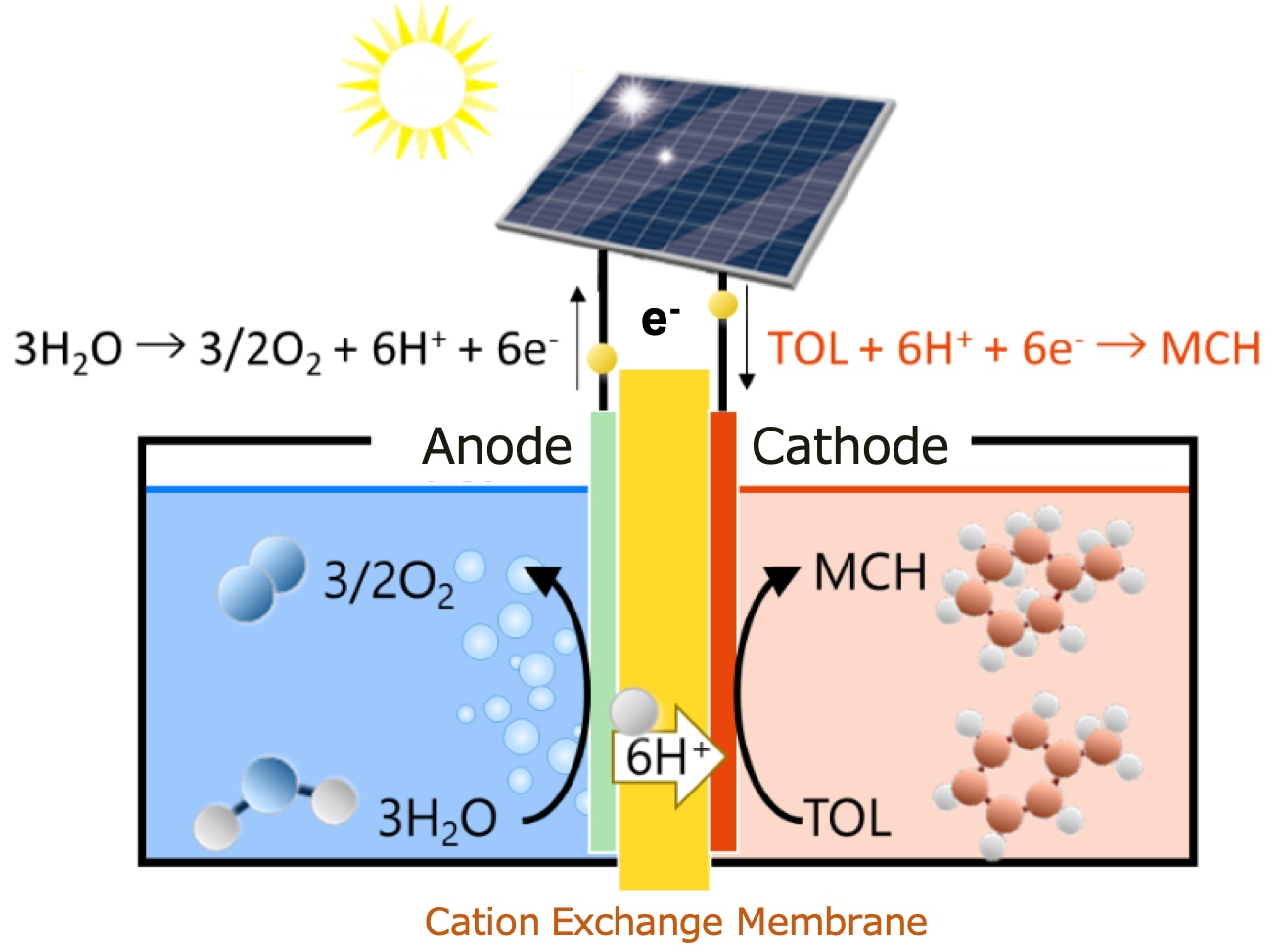 The energy-demanding process of hydrogen electrolysis involves the splitting of water molecules (H2O) into hydrogen (H2) and oxygen (O2), producing hydrogen gas that can be used as fuel in vehicles with only water as a by-product. Areas abundant in renewable energy are thus attractive sites for hydrogen “harvesting” plants, but their uneven distribution poses a problem for the scaling of global hydrogen supply chains. ENEOS is working on a process called the Direct MCH® process, in which hydrogen molecules are added to toluene, generating hydrogen-carrying methylcyclohexane (MCH). This substance is compatible with existing petroleum infrastructures and, when compared in the same volume, it can be used to transport 500 times more hydrogen than hydrogen gas. MCH generated at a solar-powered Direct MCH® electrolyzer demonstration plant in Australia has successfully been transported and used to power a fuel cell bus in Japan.
