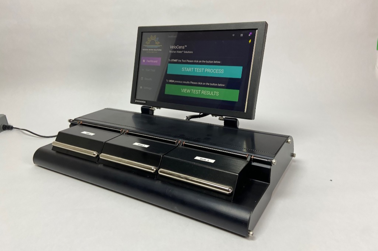 VeloCens™ uses a light-addressable potentiometric sensor (an electrochemical sensor technology that detects changes in voltage caused by the presence of target substances) combined with nanotechnology-sensor-based test cartridges to quickly test water for E. coli and total coliform within one hour. The nanostructures on the cartridges attract targeted species of bacteria and are highly sensitive to their activity, allowing for on-site, on-demand water quality monitoring. This provides real-time decisions about water safety, significantly improving turnaround time by 18 times compared to traditional methods. VeloCens™ follows stringent protocols, ensuring its performance matches that of standard microbiological lab equipment. All sample data is automatically logged into a cloud data center, offering 24/7 access, where results can be mapped by location and time.