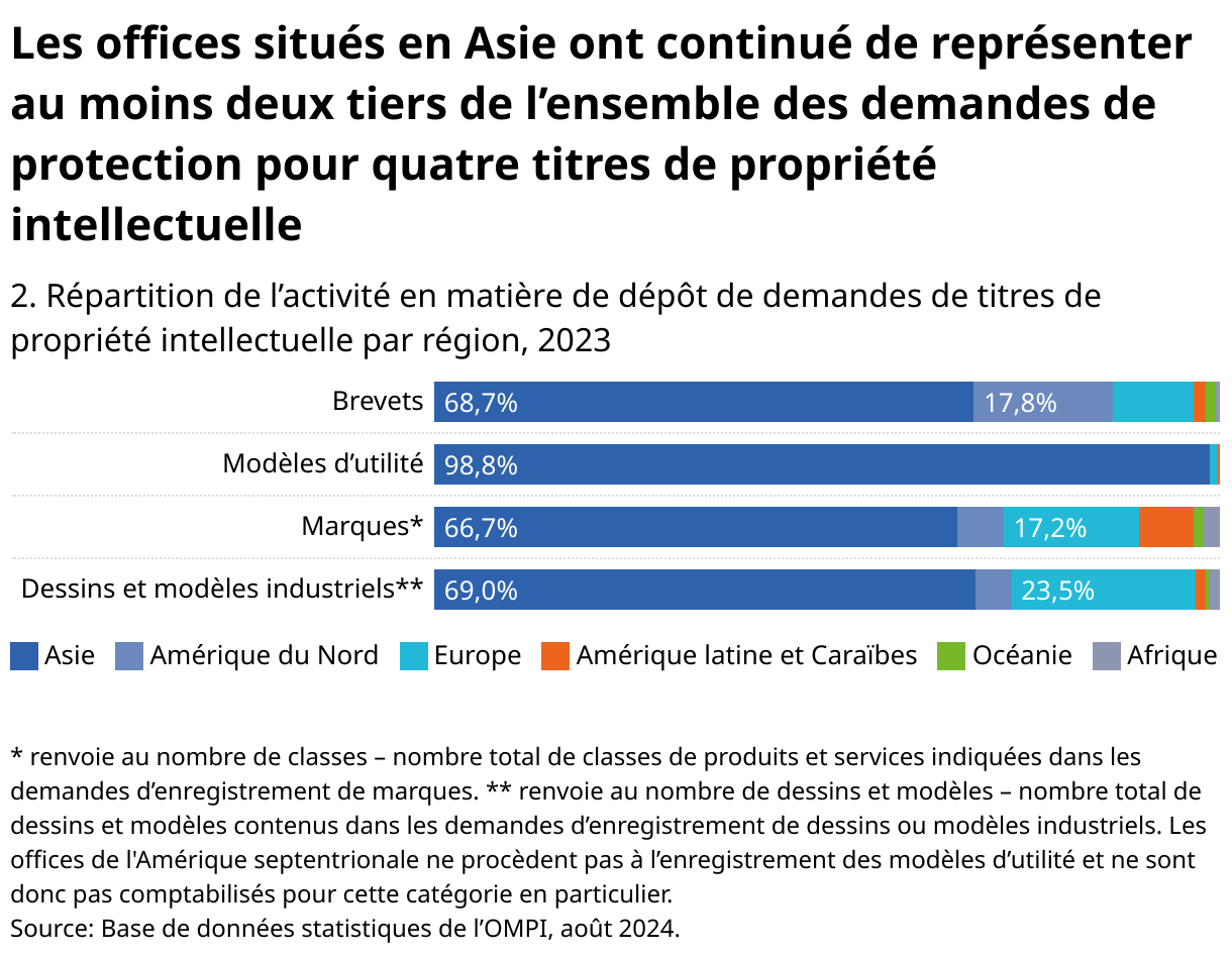 Les offices situés en Asie ont continué de représenter environ 70% du nombre total de demandes déposées dans le monde pour les brevets, les marques et les dessins et modèles industriels, et comptent pour la quasi-totalité de l’activité mondiale de dépôt des demandes d’enregistrement de modèles d’utilité. Au cours de la dernière décennie, la part de l’Asie dans le nombre total de demandes déposées dans le monde pour ces quatre titres de propriété intellectuelle a considérablement augmenté. Par exemple, la part de l’Asie dans le nombre total de demandes de brevet déposées dans le monde est passée de 58,4% en 2013 à 68,7% en 2023. En Asie, les demandes de titres sont fortement concentrées au sein des offices de la Chine, du Japon et de la République de Corée. Par exemple, dans le cas des brevets, ces trois offices représentaient à eux seuls une part combinée de 91,1% de tous les dépôts asiatiques pour ce droit de propriété intellectuelle en 2023.