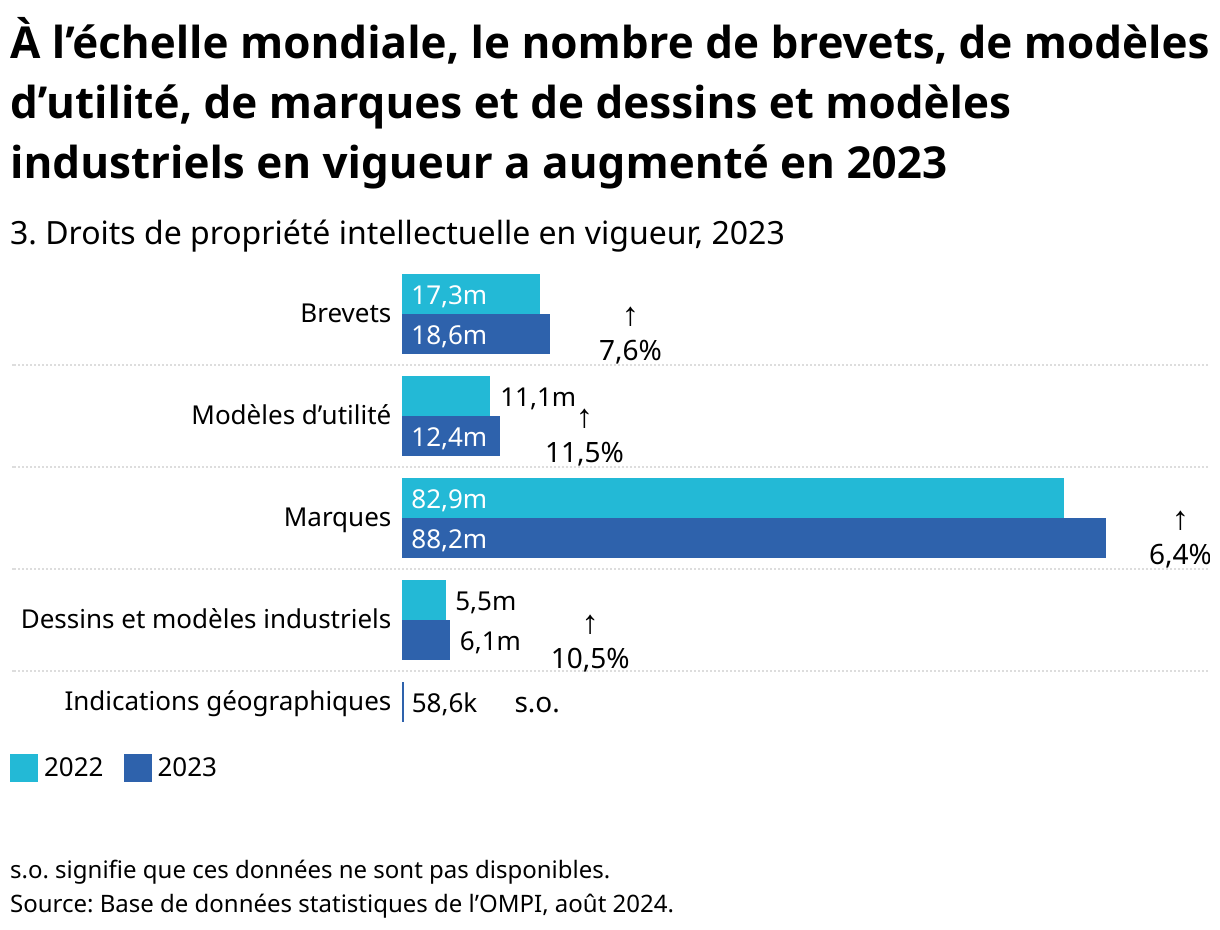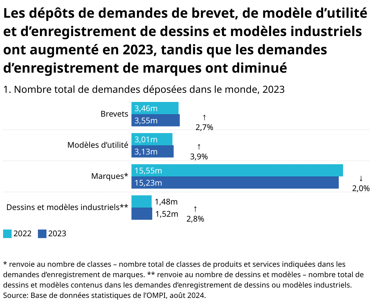 Les dépôts de demandes de brevet dans le monde ont augmenté de 2,7% en 2023, accompagnés d’une croissance de 3,9% des demandes de modèle d’utilité – une forme particulière de droit de brevet. Plus précisément, les dépôts de demandes de brevet dans le monde ont atteint 3,6 millions, tandis que les demandes de modèles d’utilité se sont élevées à 3,1 millions. Les demandes d’enregistrement de marques se sont élevées à 15,2 millions, soit une baisse de 2% par rapport à 2022, une baisse toutefois beaucoup moins prononcée que l’année précédente. Les dépôts de dessins et modèles industriels ont connu un rebond après la baisse enregistrée en 2022, augmentant de 2,8% pour atteindre 1,5 million en 2023.