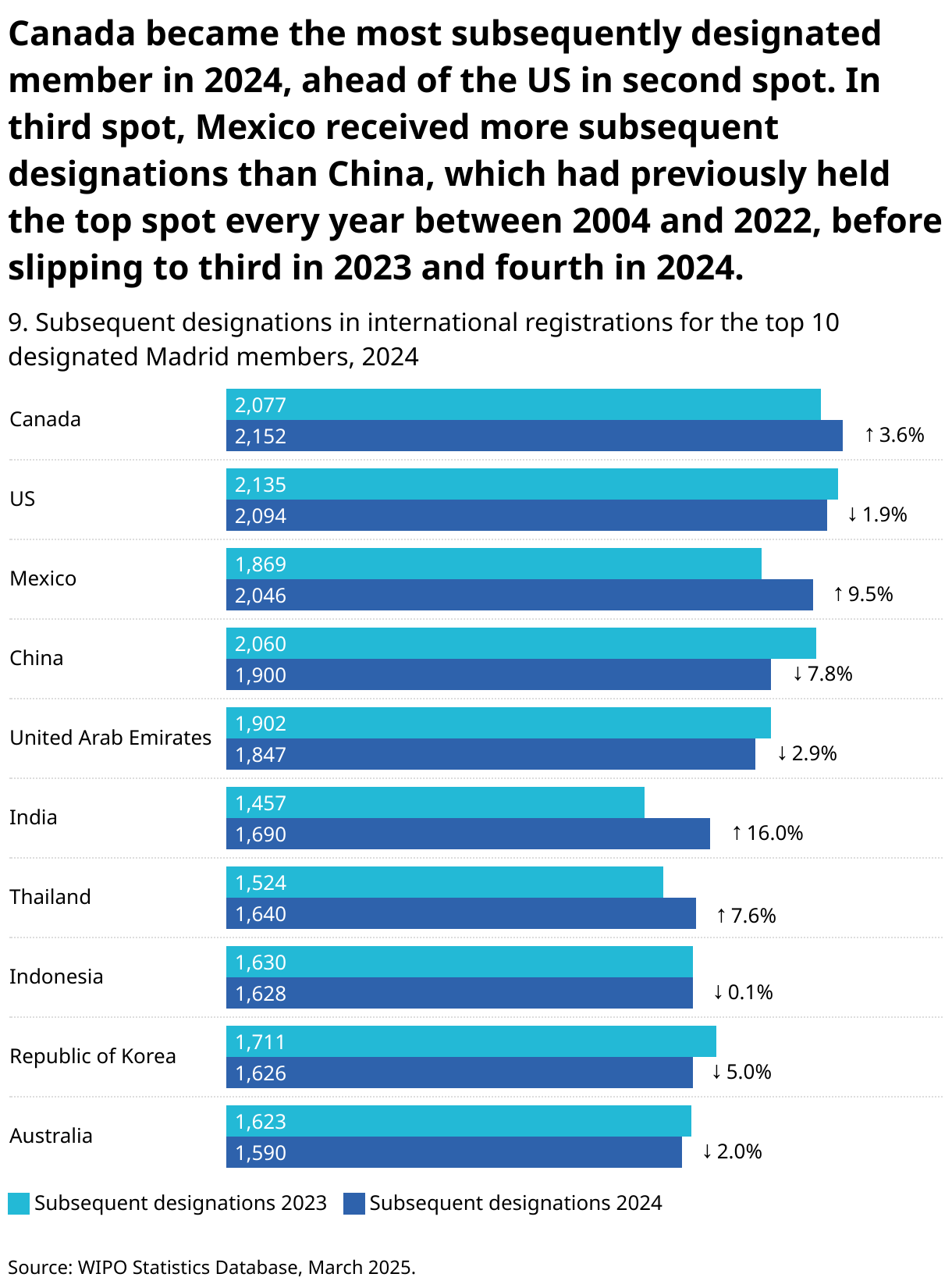 Canada (2,152) surpassed the US (2,094) to become the Madrid member to have received the highest number of subsequent designations in 2024 (figure 9). Canada and the US were followed by Mexico (2,046), which moved up two places from fifth in 2023 to third spot. China held the position of most subsequently designated country every year between 2004 and 2022, but was fourth in 2024, having fallen to third position in 2023. This decline has been due, in part, to annual decreases of about 7–8% in the number of subsequent designations received in each of the last two years. The United Arab Emirates (1,847) and India (1,690) round out the top six in 2024.