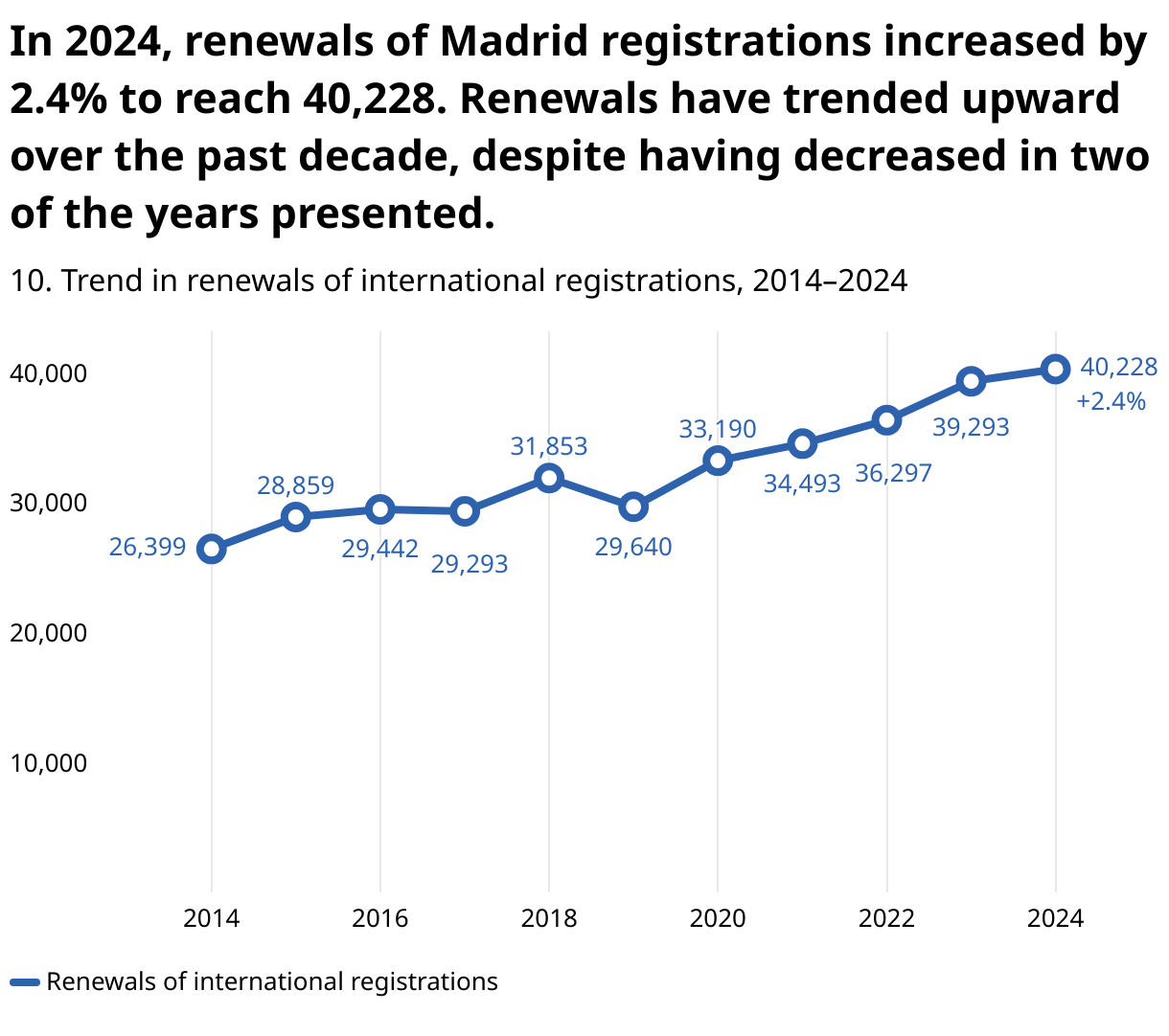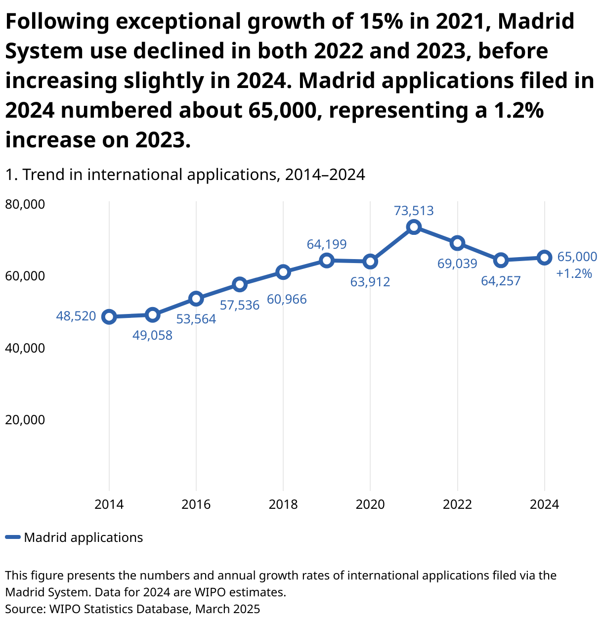 Use of the international trademark system for brand protection in 2024 increased by 1.2% in 2024, reversing course after two years of decline. Trademark holders filed an estimated 65,000 international applications via the Madrid System in 2024
