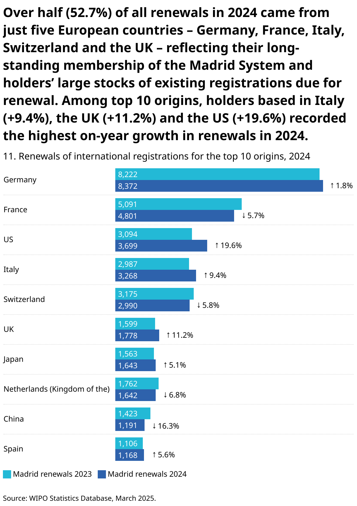 The highest number of renewals in 2024 were recorded by holders from Germany, France, the US, Italy and Switzerland