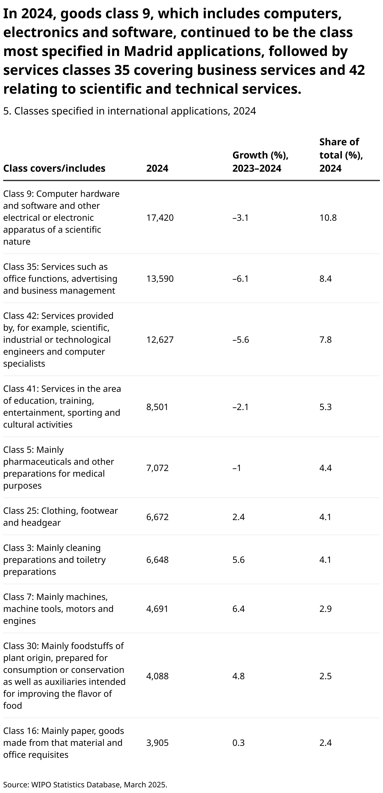 Since 1985, the most specified of the 45 Nice classes has been goods class 9, which includes computer hardware and software and other electrical or electronic apparatus of a scientific nature. In 2024, class 9 alone accounted for slightly more than a 10th (10.8%) of all classes specified in applications filed, but slightly less than the 11% recorded in 2023 (figure 5). The other most specified classes were class 35 (8.4% of the total), which covers services such as office functions, advertising and business management; class 42 (7.8%), which includes services provided by, for example, scientific, industrial or technological engineers and computer specialists; class 41 (5.3%), which mainly covers services in the areas of education, training, entertainment, sporting and cultural activities; goods class 5 (4.4%), which covers pharmaceuticals and other preparations for medical purposes; and both goods class 25, which relates to clothing and apparel, and goods class 3, which covers cleaning and toiletry preparations, accounting for 4.1% each. Three of the five most specified classes were services classes. Among the top 10 Nice classes specified in Madrid applications, five saw growth in 2024. Eighth-ranked goods class 7, which includes machines, machine tools, motors and engines, grew by 6.4% in 2024. It was followed by goods class 3, which covers cleaning preparations and toiletry preparations and which ranked seventh in 2024, with an on-year increase of 5.6%. The third was ninth-ranked goods class 30, which covers mainly foodstuffs of plant origin, with growth of 4.8%, and the fourth was previously mentioned class 25 (+2.4%). Expanding to include all 45 Nice classes, 25 saw a decrease compared to 2023, the largest being for goods class 34 (–27.7%), which covers tobacco and smokers' articles.