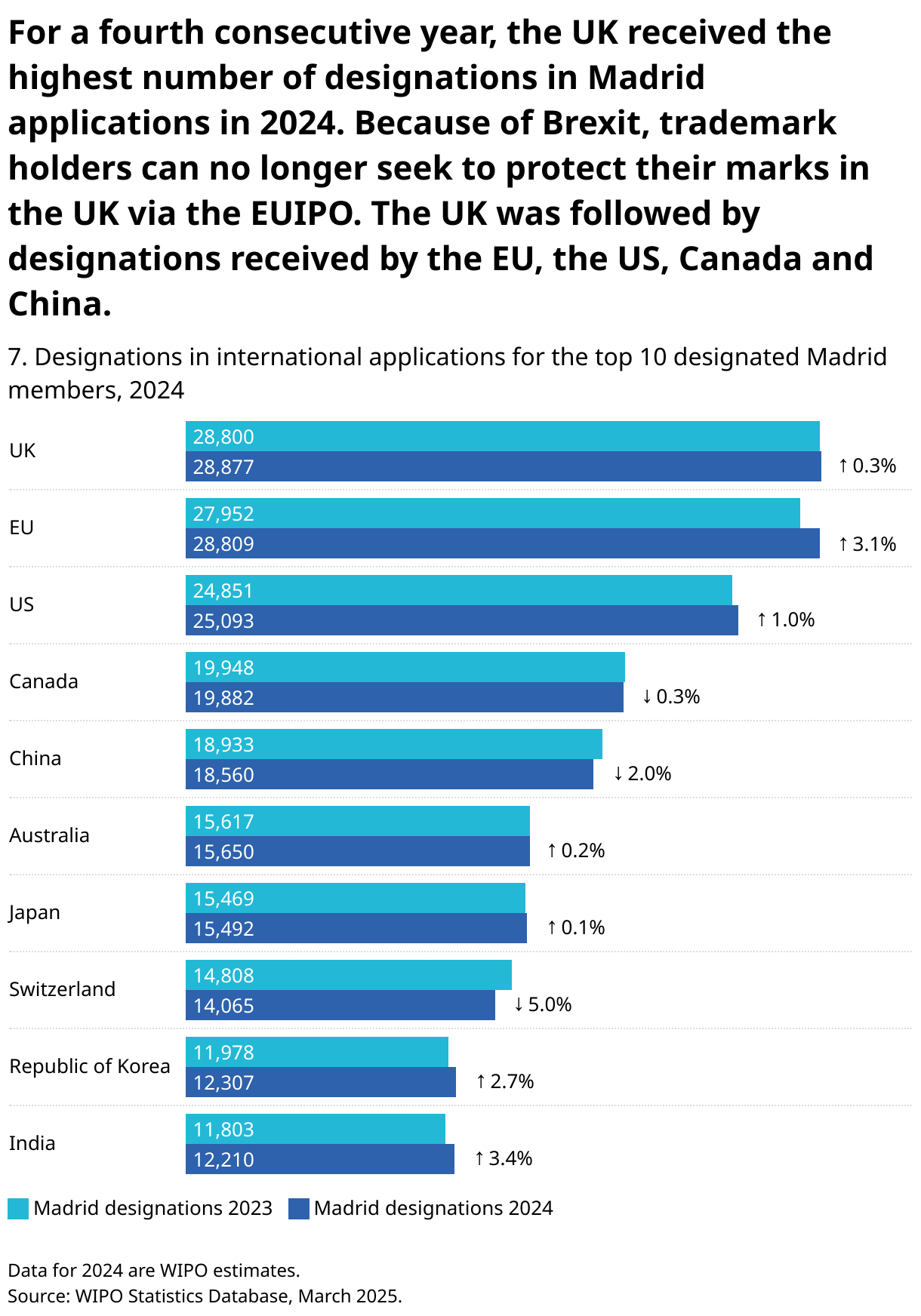For a fourth consecutive year, the UK (28,877) received the most designations in Madrid applications in 2024, once again followed by the European Union (EU) (28,809). Because of Brexit, trademark holders could no longer seek protection for their marks in the UK via the European Union Intellectual Property Office (EUIPO) once the transition period ended on December 31, 2020. Now, when using the Madrid System, holders must designate the UK separately, if they want to protect marks within this Madrid member’s jurisdiction. The UK and the EU were followed by the US (25,093), Canada (19,882) and China (18,560) (figure 7).