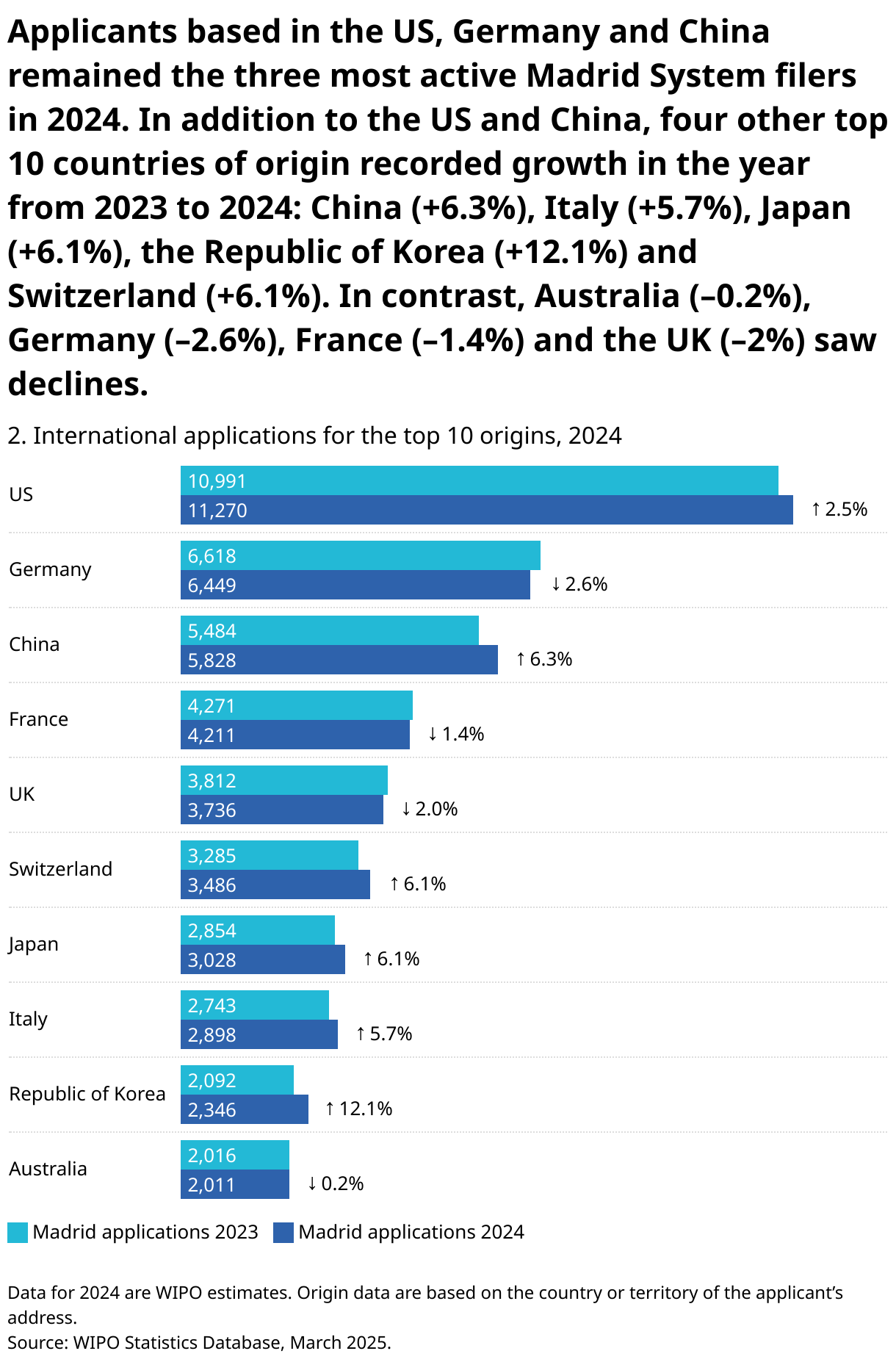 The top 10 origins collectively accounted for nearly 70% of Madrid applications filed in 2024, a share that has remained largely consistent over the past decade. The composition and ranking of the top 10 origins in 2024 remained unchanged from 2023.