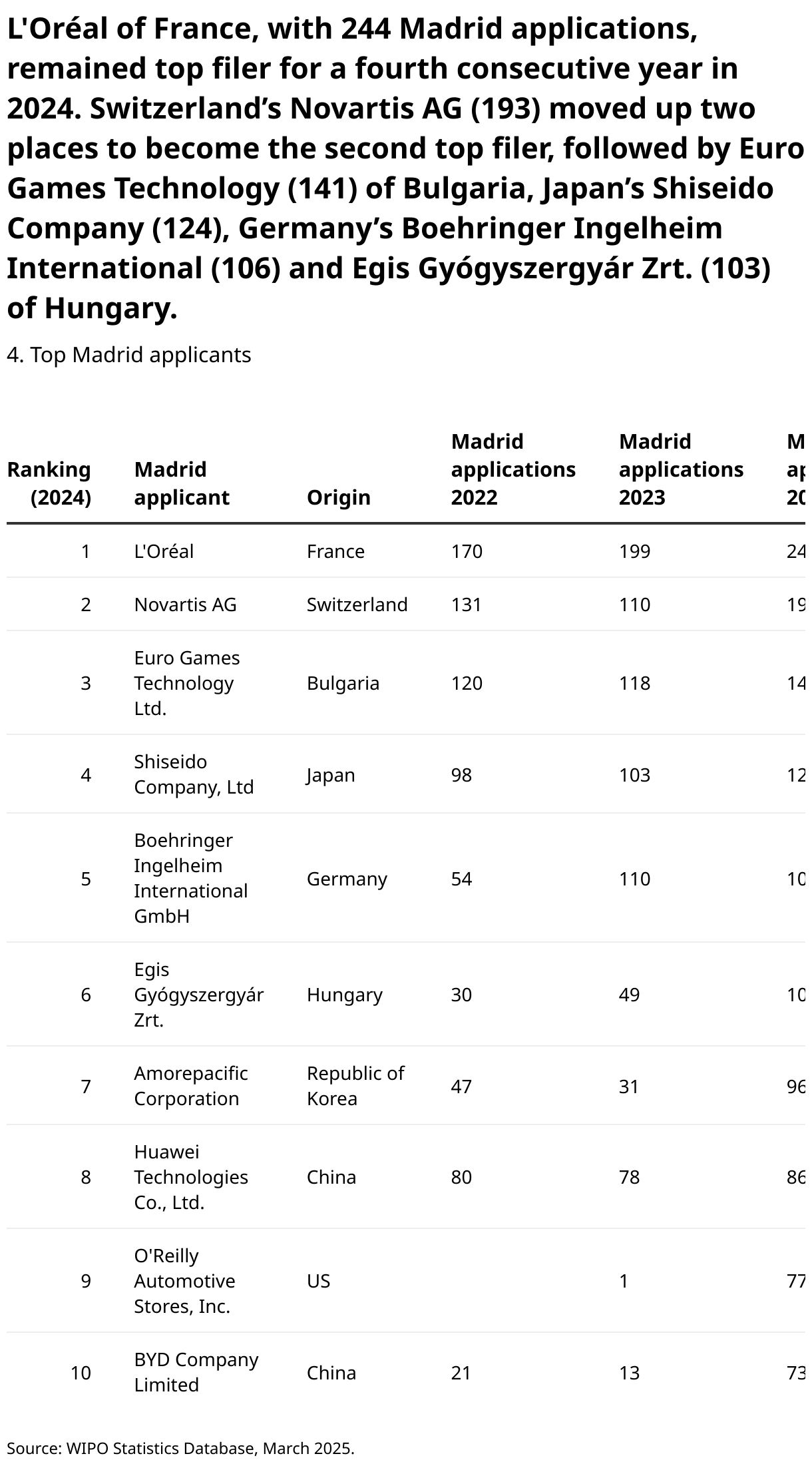 L’Oréal of France filed 244 Madrid applications in 2024, the highest number filed by any individual applicant that year. Novartis AG (193 applications) of Switzerland climbed two spots to become the second top filer, followed by Bulgaria’s Euro Games Technology (141). Rounding out the top fourth to sixth spot were Japanese beauty and cosmetics producer Shiseido Company (124) and two pharmaceutical companies: Boehringer Ingelheim International of Germany (106) and Egis Gyógyszergyár Zrt. (103) of Hungary (figure 4). Egis Gyógyszergyár Zrt. filed 54 more applications in 2024 than in 2023, propelling it from 18th position in 2023 to become the sixth most active applicant in 2024. Similarly, among the top 10 Madrid applicants, beauty and cosmetics company Amorepacific Corporation (+65 applications) of the Republic of Korea, Chinese electric car manufacturer BYD Company (+60), L’Oréal (+45), Novartis AG (+83) and auto parts retailer O’Reilly Automotive Stores (+76) of the US also recorded among the highest increases in applications filed between 2023 and 2024. In contrast, Boehringer Ingelheim International, which held fourth spot in 2023, filed four fewer applications in 2024 compared to the previous year, dropping down one spot to fifth place. Bayerische Motoren Werke AG (BMW) filed 89 fewer Madrid applications in 2024, resulting in its ranking dropping from second top applicant in 2023 to 40th in 2024.