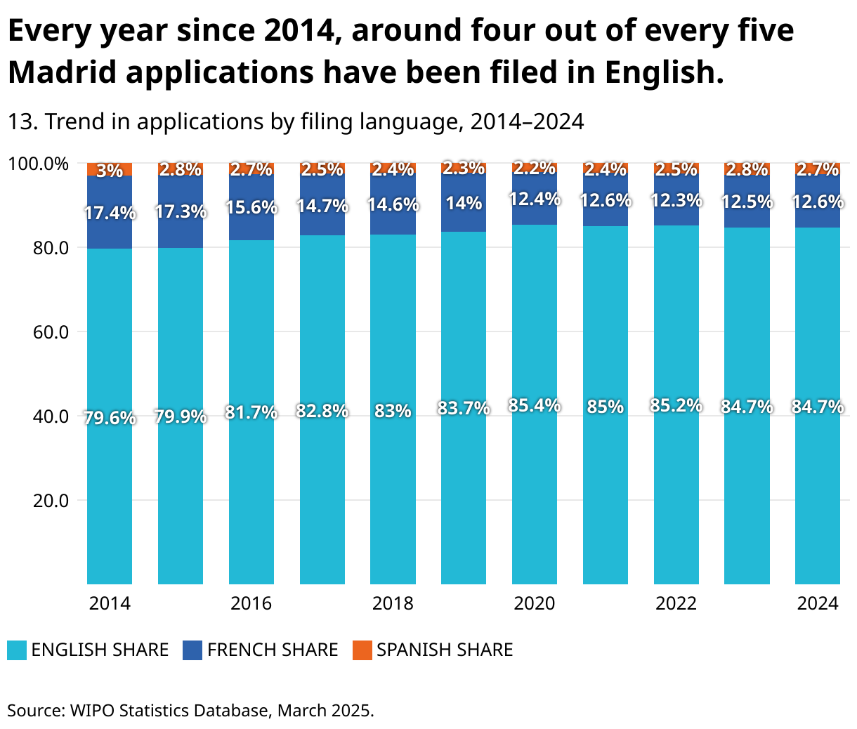 In 2024, 84.7% of Madrid applications were submitted in English, 12.6% in French and 2.7% in Spanish (figure 13). Every year since 2014, about four out of every five applications have been submitted in English. The reason for only a small proportion of applications having been submitted in Spanish since it was introduced as an official Madrid language in 2004 is that, to date, the Madrid System includes only five Spanish-speaking countries (Chile, Colombia, Cuba, Mexico and Spain), of which Spain alone is a top 20 origin of Madrid applications.