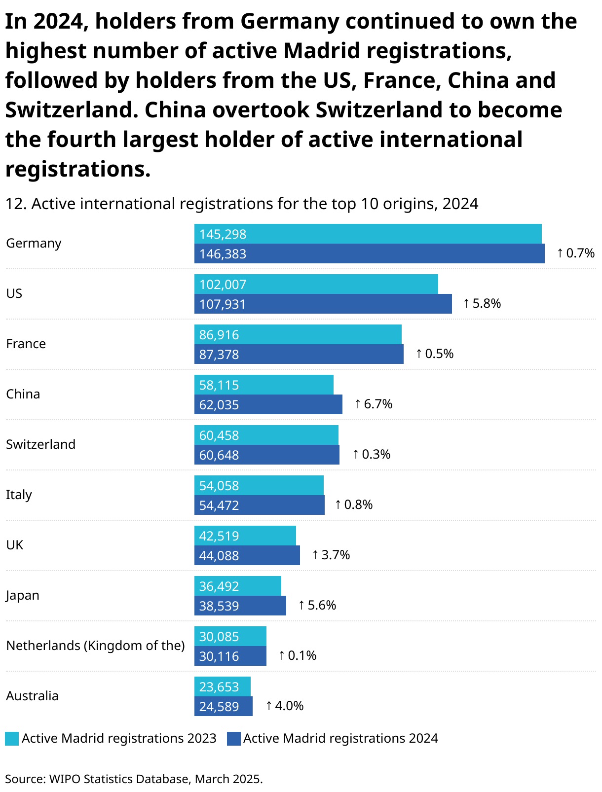 Holders from just five countries – Germany, the US, France, China and Switzerland – owned over half (50.7%) of all Madrid registrations active in 2024
