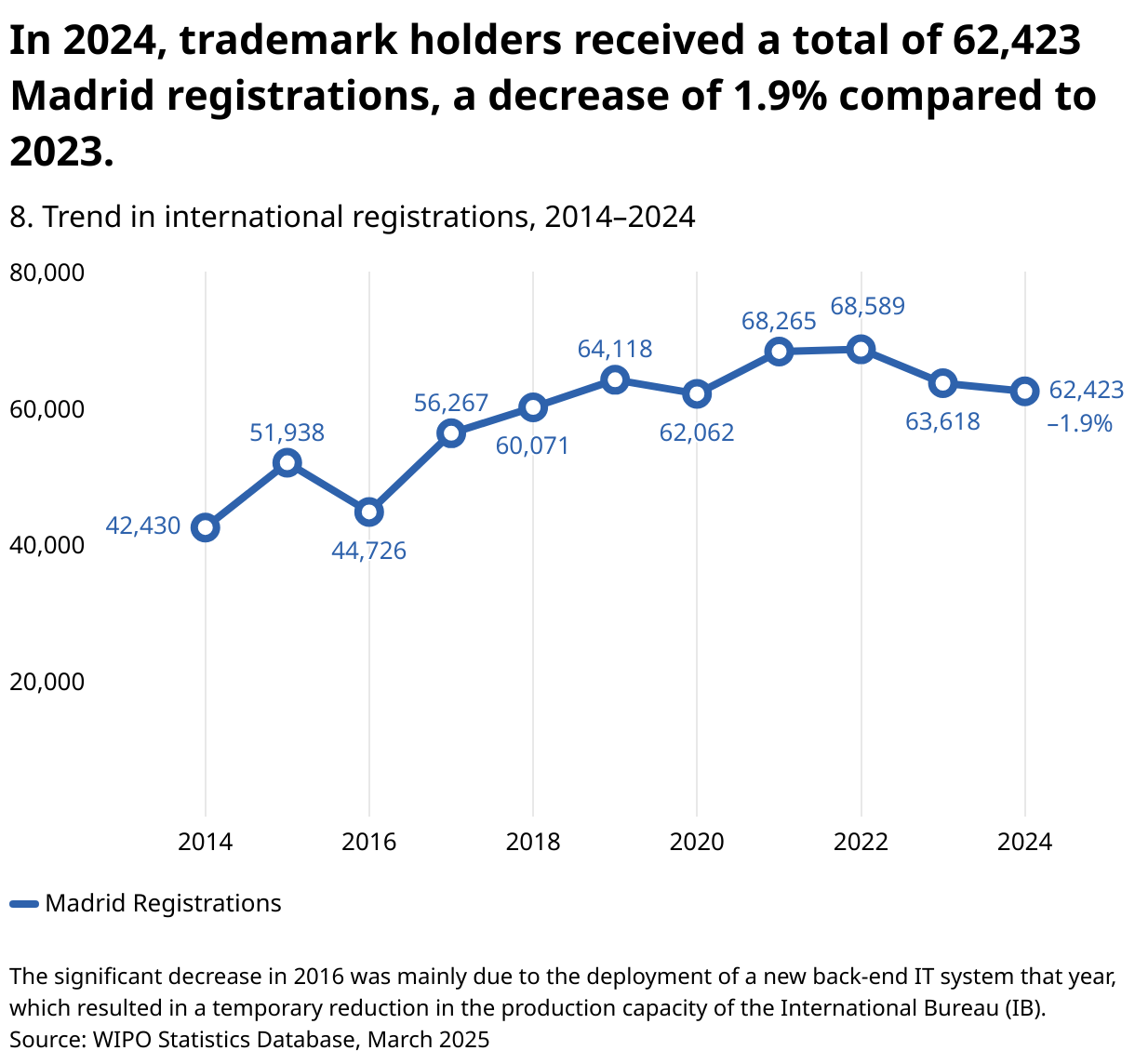 Trademark holders worldwide obtained 62,423 Madrid international registrations in 2024, a decrease of 1.9% compared to 2023