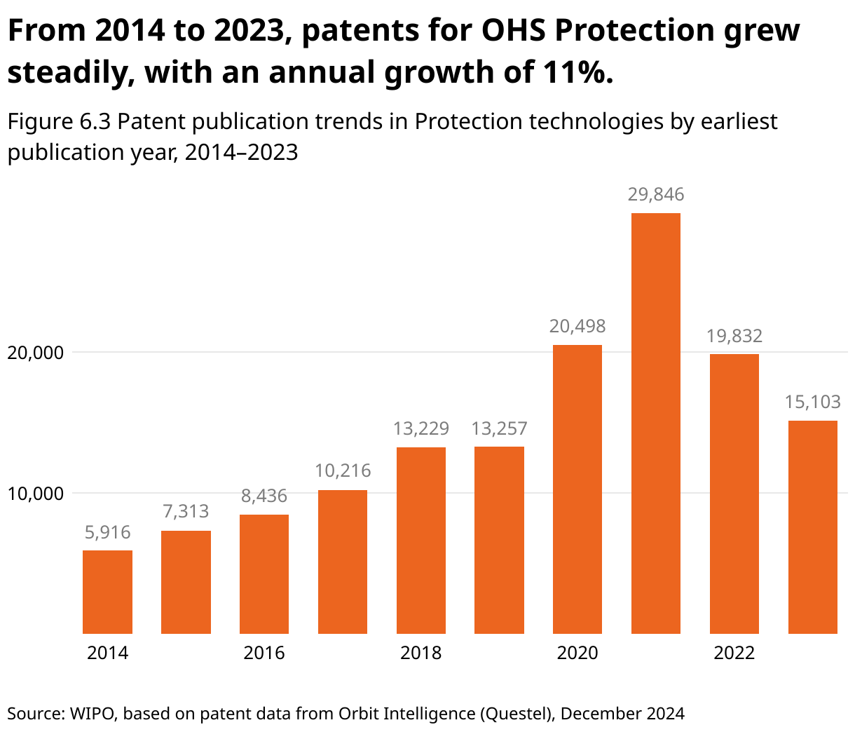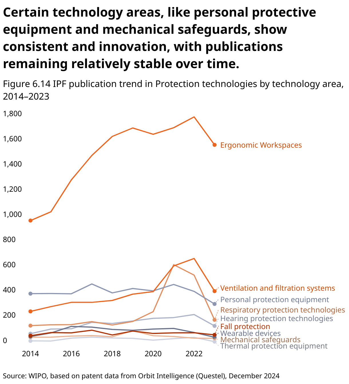 Thermal protection equipment: The smallest technology area, with 5,015 patent families, focuses on protective gear that shields workers from extreme temperatures, whether hot or cold.