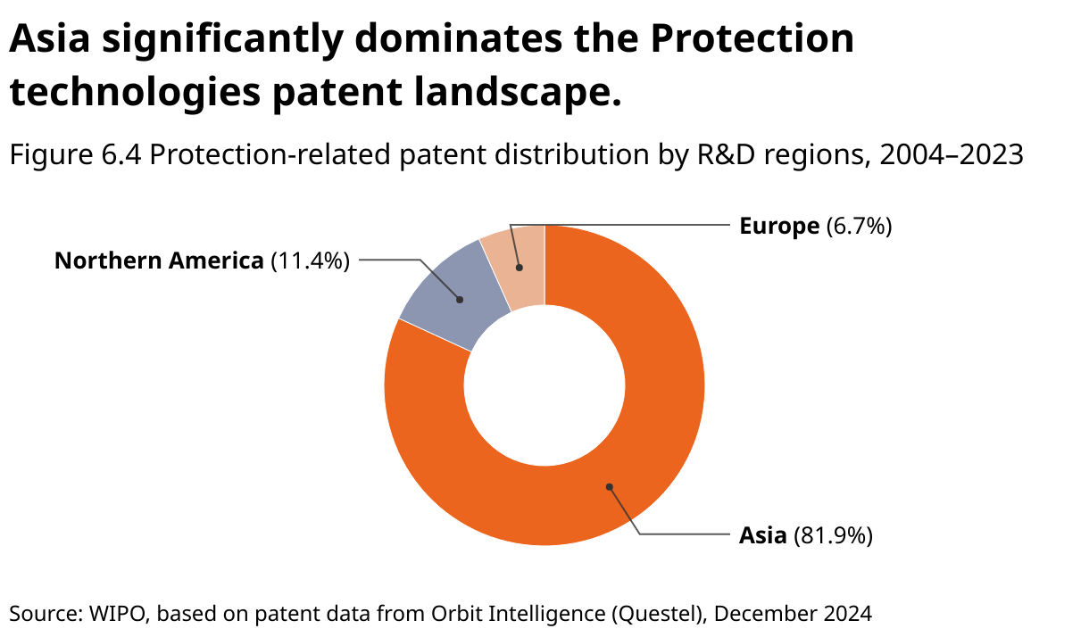 In the field of Protection, Asia is again the main region (Figure 6.4) accounting for almost 82% of all patents. The United States accounts for almost 95% of the filings from the Americas (11.4% of all Protection patents), followed by Europe.