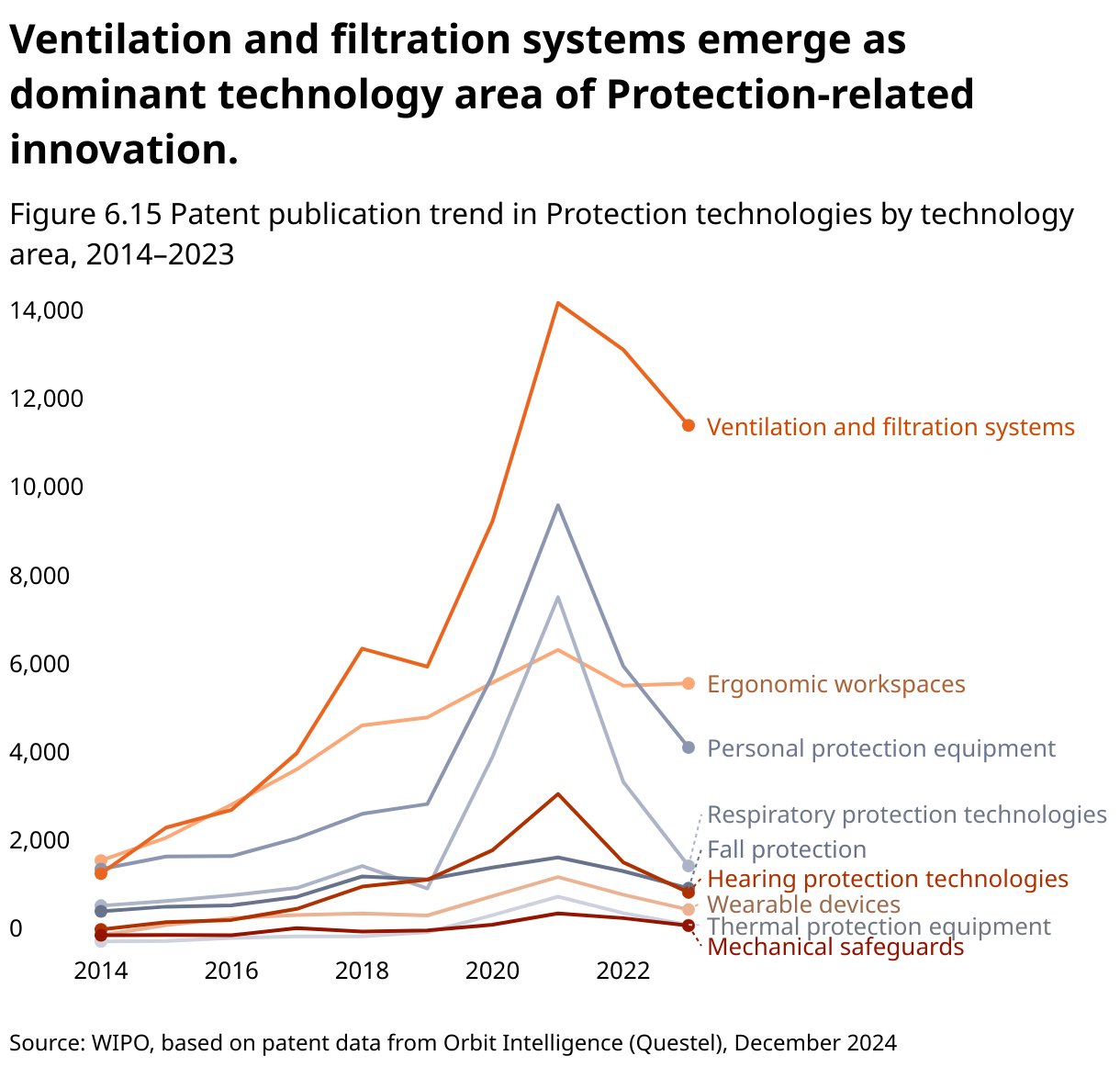 Overall trends reveal a mix of sharp increases in filings, particularly in 2021 due to external factors such as the COVID-19 pandemic, followed by a decline over recent years. Some technology areas, such as PPE and mechanical safeguards, have demonstrated steady, ongoing innovation with little fluctuation in filings over time.