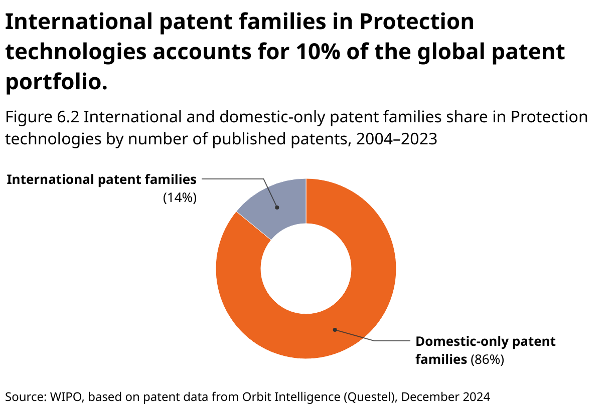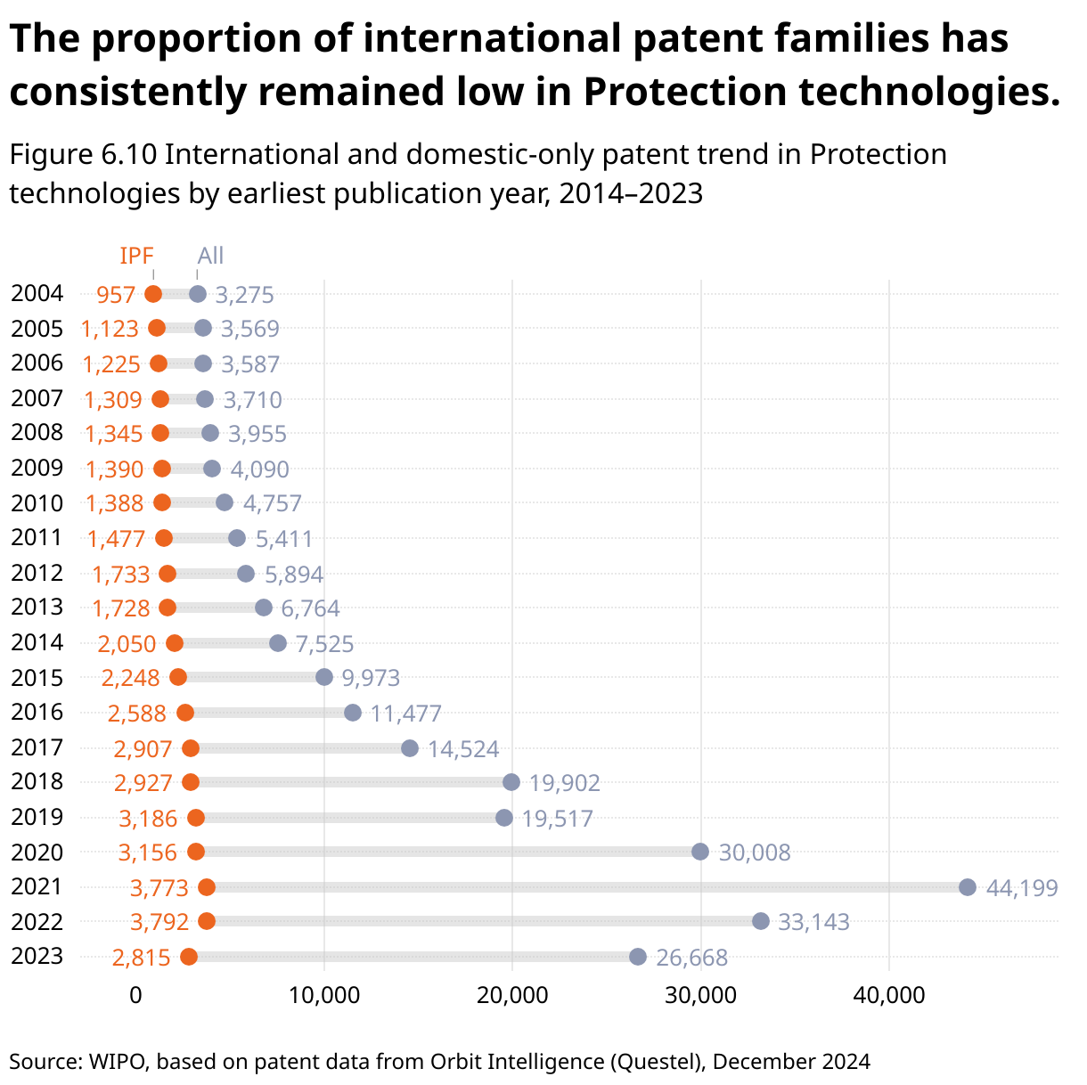 Figure 6.3 highlights a clear divergence between domestic-only patent filings and IPFs in the field of Protection technologies. While the total number of patents has shown consistent growth, particularly after 2018, the share of IPFs as a percentage of total patents has steadily declined from 29% in 2004 to 11% in 2023, as shown in Figure 6.10. This indicates that the majority of recent patenting activity is concentrated in local filings, with fewer inventions being pursued for international patent protection.