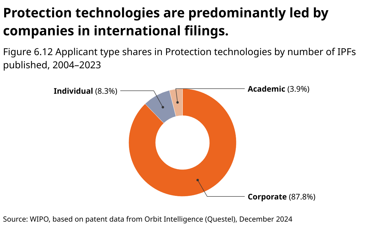 The OHS category of Protection technologies is dominated by corporate entitites, with Figure 6.12 showing that 88% of IPFs come from the corporate sector. Conversely, academic applicants account for only 5% of all patents applicants, contributing to just 4% of IPFs, indicating limited involvement from the academic sector in this domain.