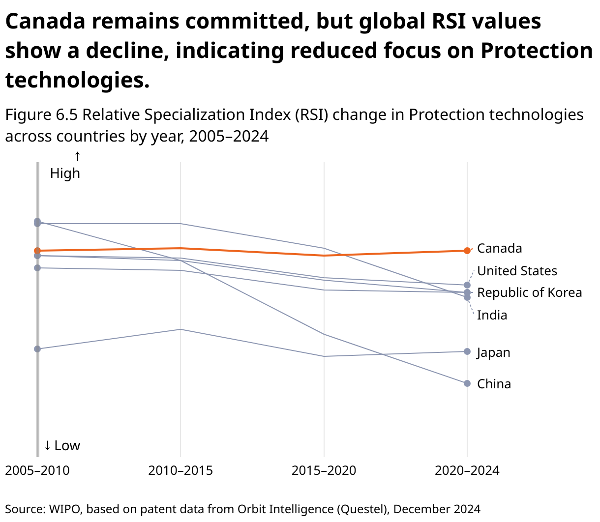 Initially India showed strong specialization but experienced a gradual decline over recent years. China, despite early prominence, has seen its RSI value decrease significantly after 2015. In contrast, Canada, the United States and the Republic of Korea have maintained a steady RSI value, indicating consistent relative specialization in this field. Japan shows the lowest and most stable RSI value, reflecting a limited focus on this domain. Overall, the data suggest a weakening specialization for leading countries like China and India, while other regions are maintaining a steadily moderate focus.