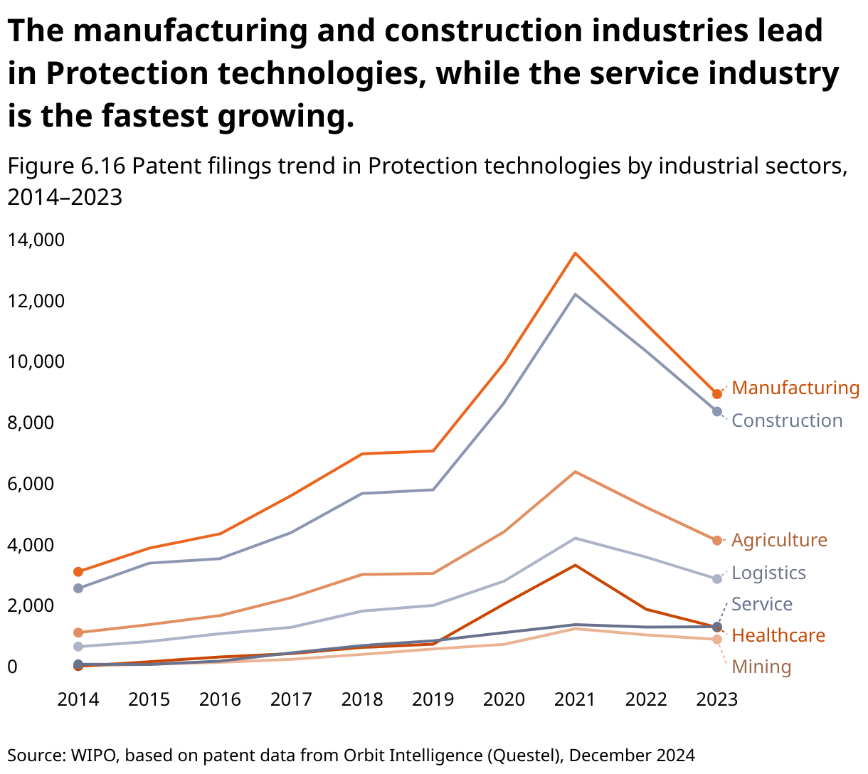 Patent filings in the OHS Protection category reveal significant sectoral differences in terms of innovation trend between 2018 and 2023. The construction and manufacturing sectors dominated in terms of volume, peaking in 2021, likely driven by heightened safety concerns during the COVID-19 pandemic, followed by a noticeable decline by 2023. Agriculture, logistics, and services sectors showed steady but moderate growth, with a slight drop post-2021, indicating sustained yet less dynamic innovation. Meanwhile, healthcare exhibited volatility, with a sharp rise to 2021, but a significant decline reflecting fluctuating priorities. The mining sector maintained relatively steady growth throughout, reflecting its consistent focus on safety improvements. These trends highlight the varied impact of external factors and sector-specific needs on occupational safety innovation.
