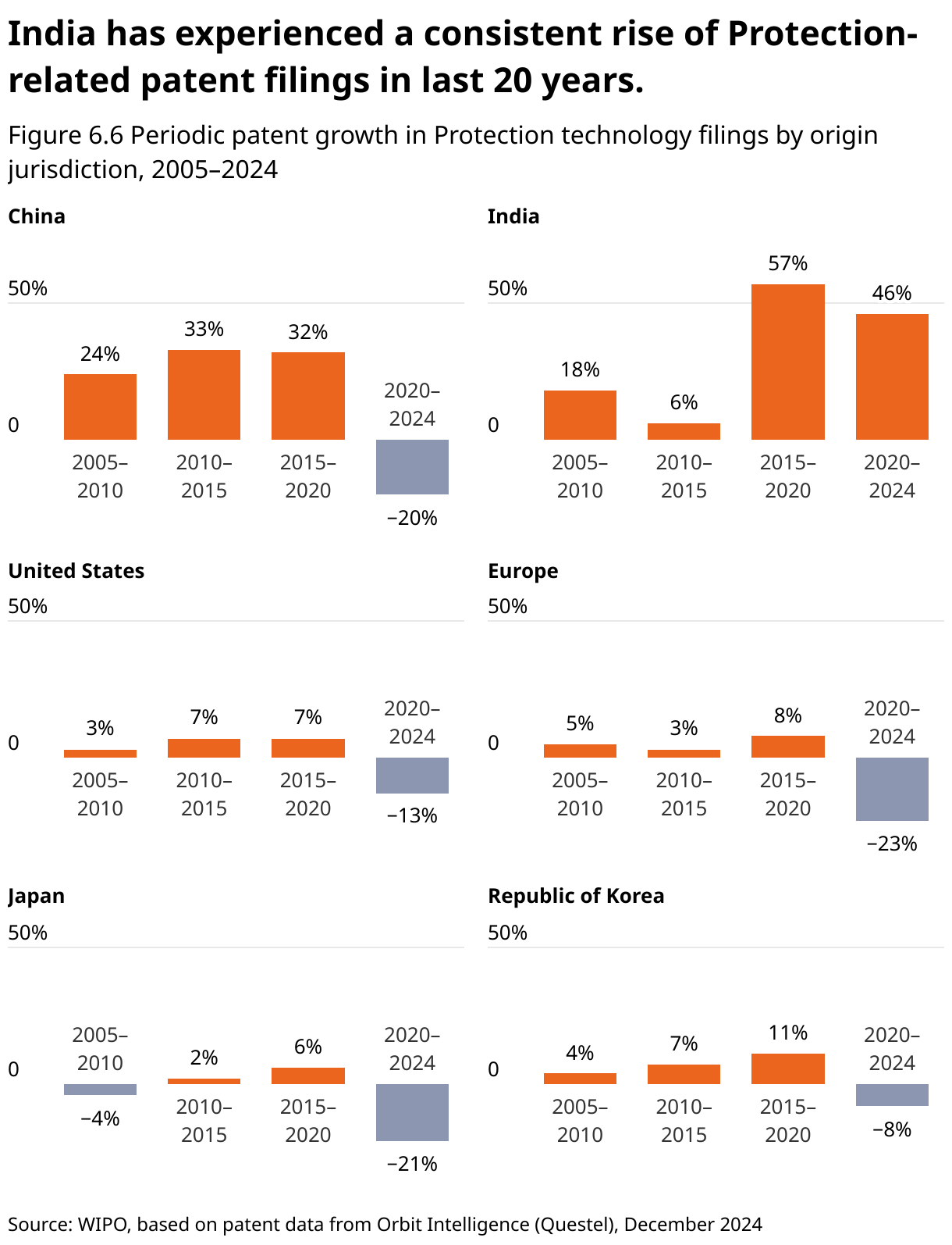 Periodic patent growth in Protection technologies reveals varied trends across countries. China and India lead with strong growth, particularly during the mid-period, but whereas India has sustained a high momentum, China experienced a decline after 2020. Northern America, Europe, and Japan showed slow, incremental growth before facing a noticeable downturn over recent years. The Republic of Korea has maintained moderate growth but has also seen a slight decline more recently. Overall, India stands out as a consistent driver of innovation, while other regions, including historically strong players like China and the United States, show activity decreasing over recent years.