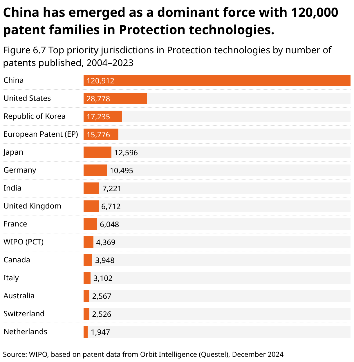Figure 6.7 highlights the dominant position of China in terms of attractiveness, accounting for a significant share of global activity. The United States ranks second, while the Republic of Korea, Japan and Europe represent important but comparatively lower protection jurisdictions.