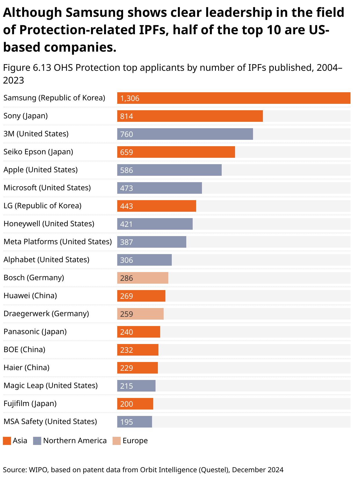 The Protection category reflects a mix of dynamic growth and steady innovation across its technologies, influenced by factors such as the COVID-19 pandemic and sector-specific needs. Key technology areas like ventilation and filtration systems, and respiratory protection technologies experienced sharp increases during the pandemic, while technology areas such as personal protection equipment (PPE) and mechanical safeguards displayed consistent, ongoing innovation. China leads global patent filings, driven by localized solutions, while global leaders like Apple, Samsung, and Honeywell emphasize diverse and expansive portfolios. This patent landscape highlights the interplay between immediate safety demands, regional priorities, and sustained investment in technologies to enhance workplace safety worldwide.