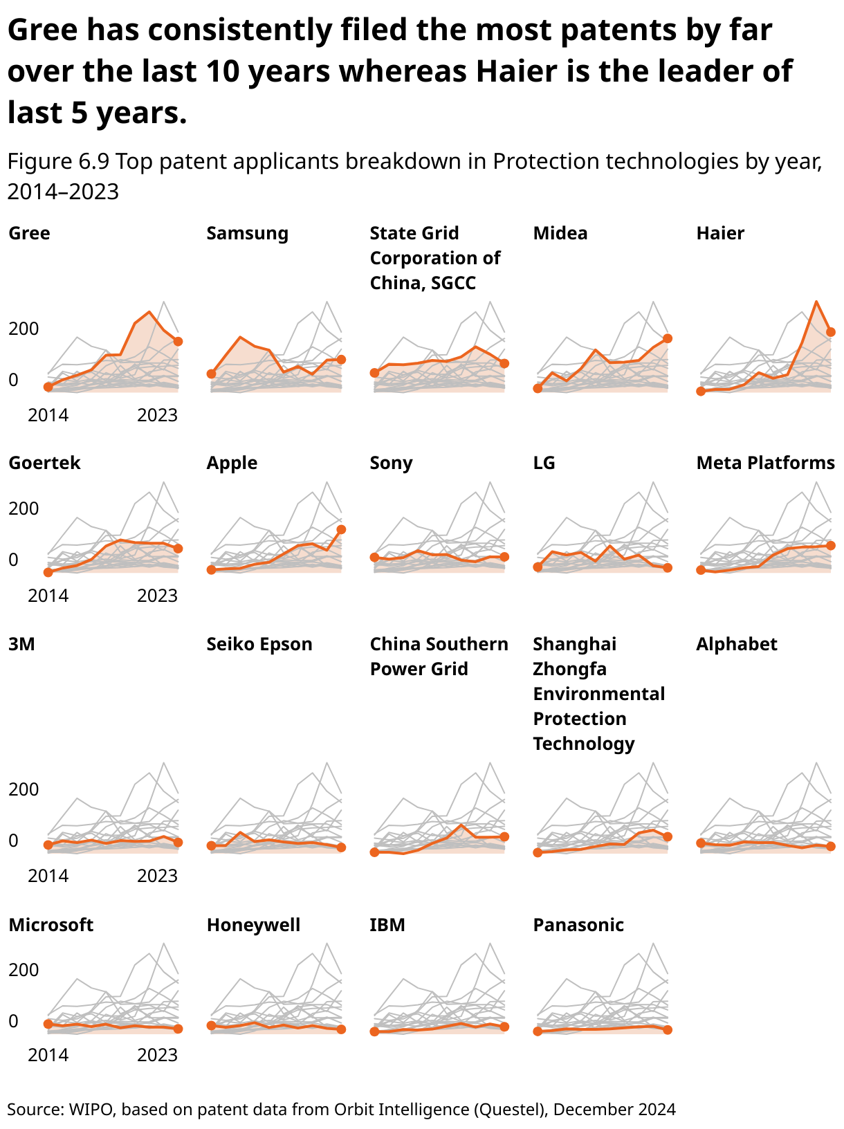 Gree tops the ranking with 1,586 patent families, closely followed by Samsung Electronics, with 1,315 patents. Midea (1,223), Haier (1,119), State Grid Corporation of China (SGCC) (905) and Apple (823) are also notable contributors.