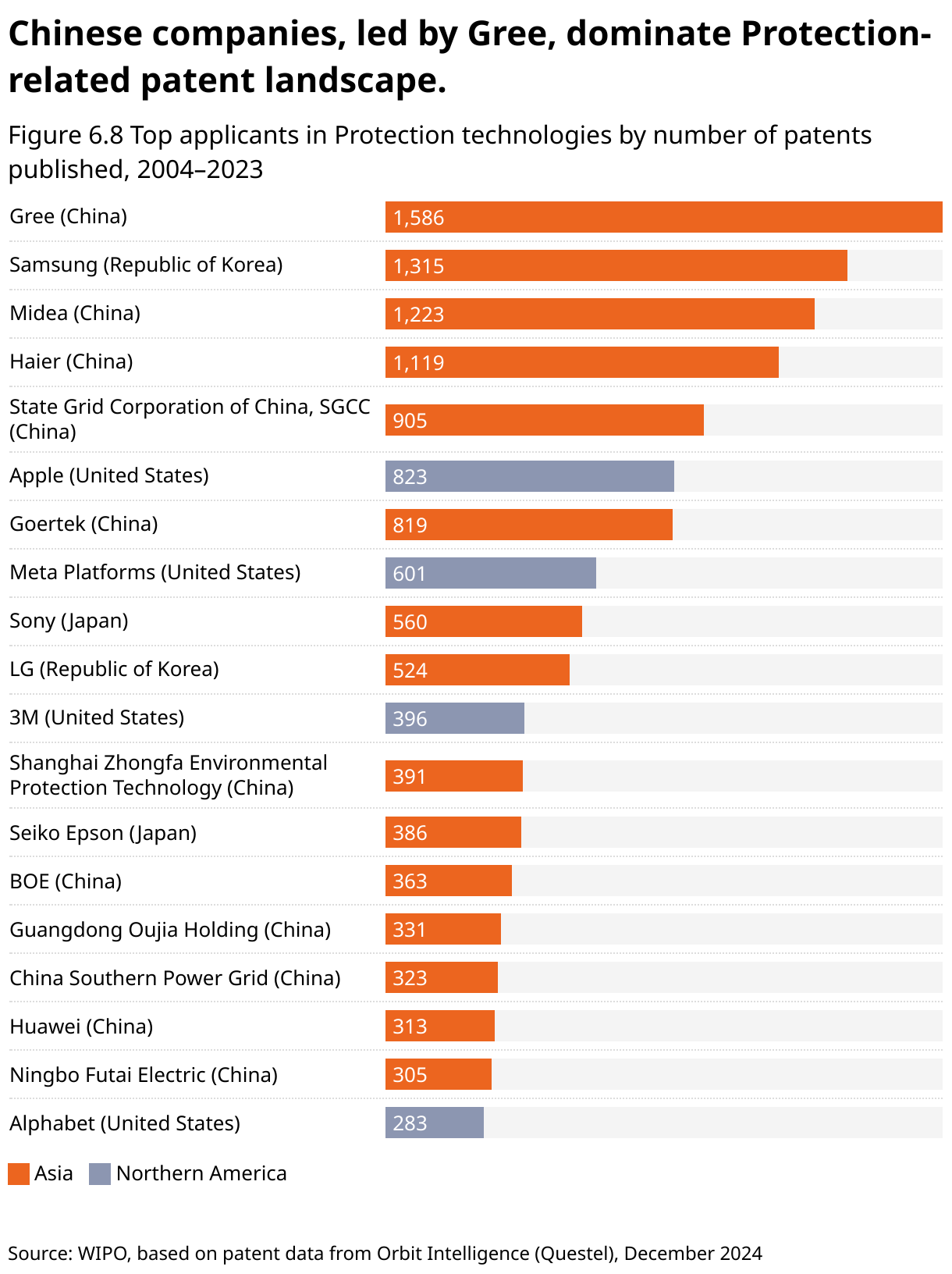 Examining the patent applicants in this area affords a comprehensive overview of those companies and organizations driving innovation and actively seeking to protect their technological advancements. This analysis identifies the key players contributing to the development of Protection solutions and spotlights their commitment to securing IP rights for their inventions. Figure 6.8 highlights Asia’s dominant positionwith many of the top patent applicants in Protection technologies coming from the region.