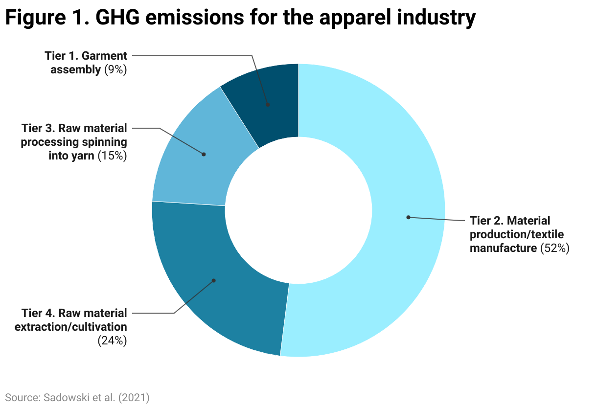 In their working paper, Sadowski et al. (2021) estimated the total GHG emissions for the apparel industry in 2019 using data from the Sustainable Apparel Coalition, Higg and Textile Exchange, split by proportion into each supply chain tier as displayed in Figure 1.