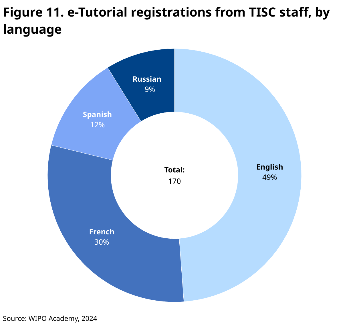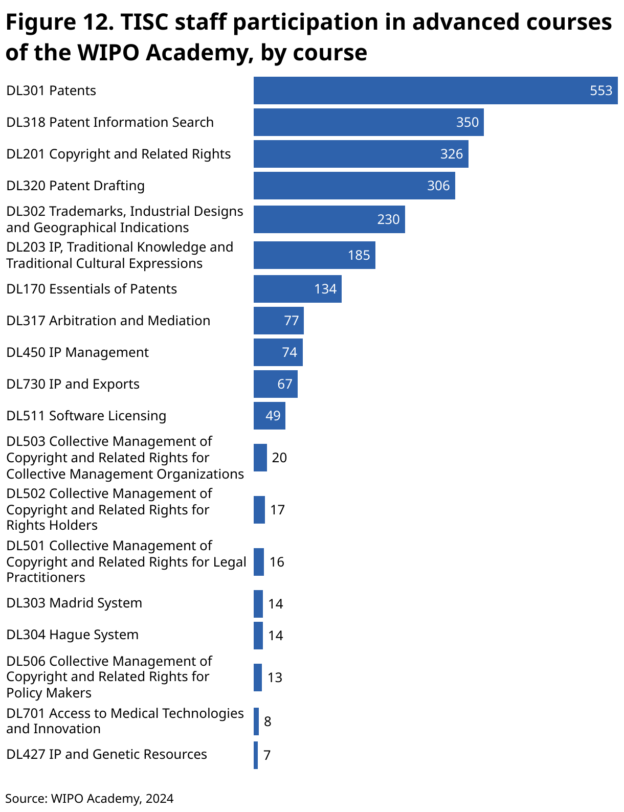 In 2024, a total of 3,661 TISC staff enhanced their expertise through distance learning courses offered by the WIPO Academy, including those in advanced specialized fields, as shown in Figure 12.