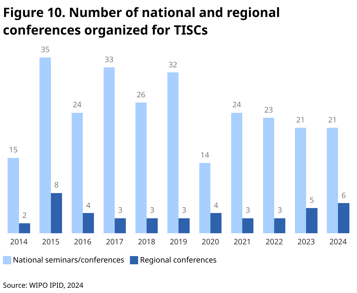 In 2024, 21 workshops were held for national TISC networks to help develop the technical skills needed to provide high-quality innovation support services to local innovators. Additionally, six regional meetings were organized for TISC networks in ARIPO member states, ASEAN member states, select networks in the Arab region, CATI-CARD and the Central Asian Republics.