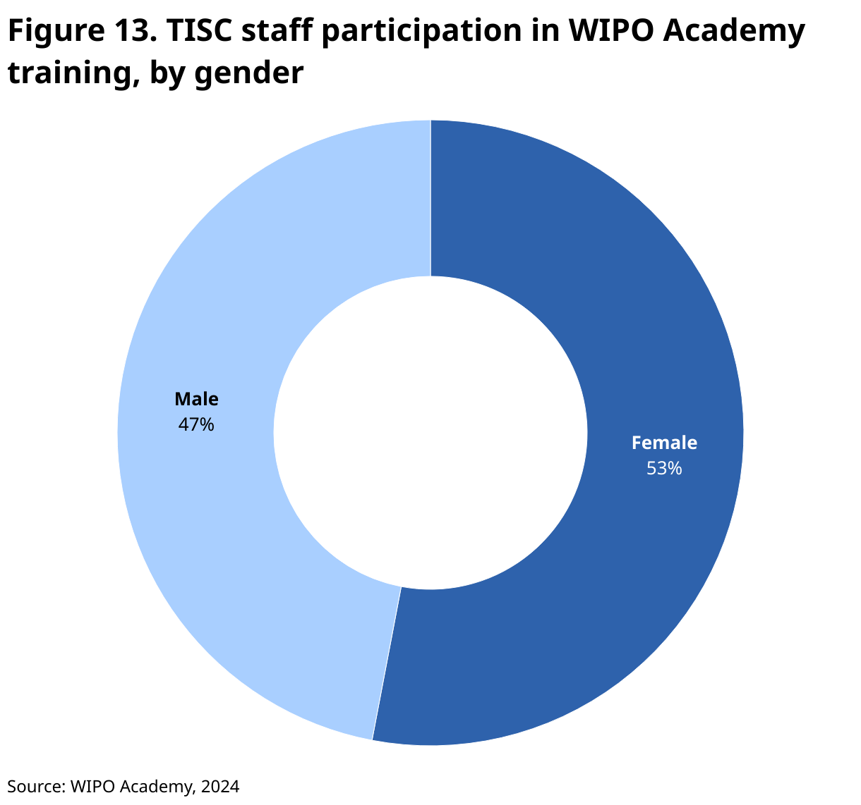 A significant share of participation continued to focus on patent-related courses, reflecting the ongoing need for TISC staff to provide high-level support to local researchers, inventors and entrepreneurs navigating the patent system. But there was also strong engagement in advanced training on trademarks, industrial designs, copyright and related rights, and IP management, indicating a growing demand for broader IP knowledge. Overall, 68 percent of TISC participation was in advanced courses, while 32 percent was in general courses. The gender distribution among participants was 53 percent female and 47 percent male (see Figure 13).